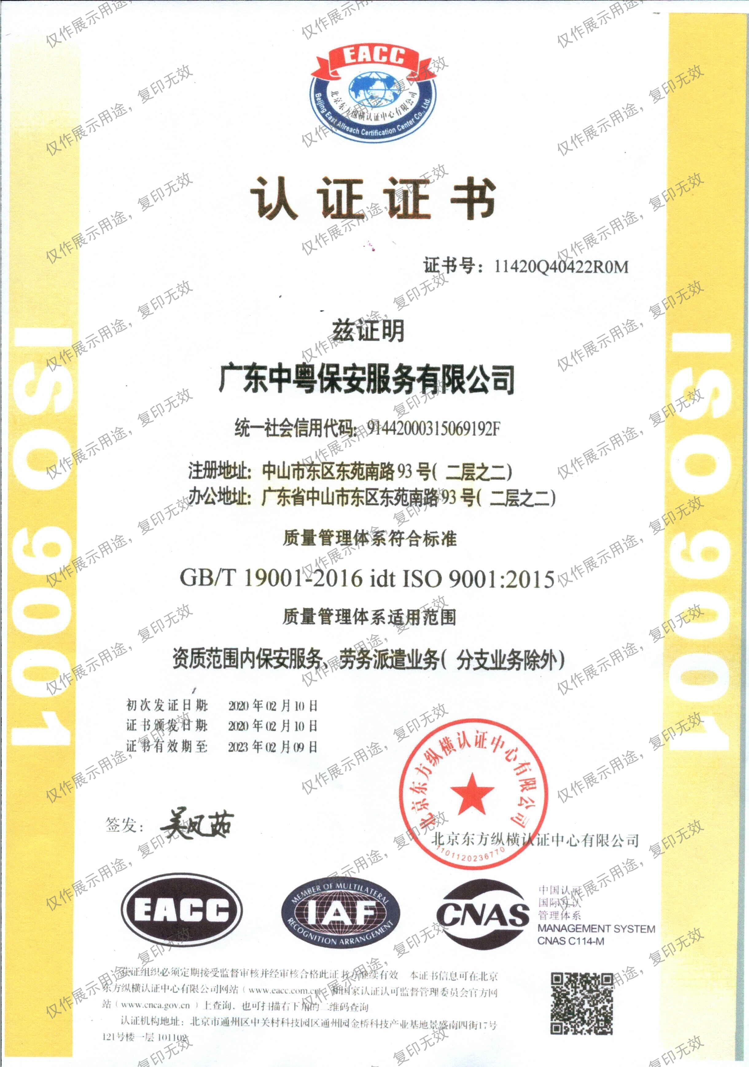 認證證書(資質范圍內保安服務、勞務派遣業務(分支業務除外))